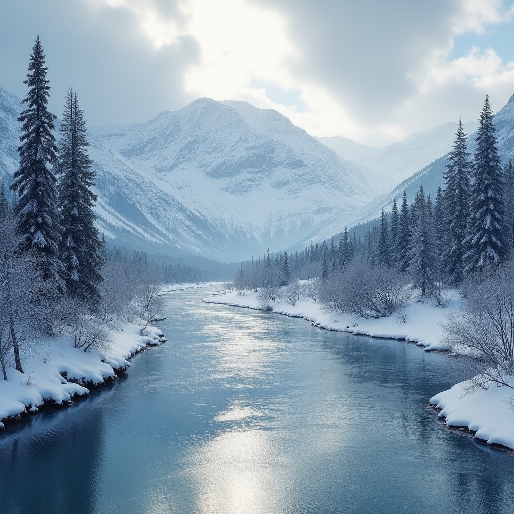 A serene river flows through a snow-covered valley flanked by dense fir trees and towering snow-capped mountains. Sunlight breaks through scattered clouds, illuminating the icy landscape and reflecting off the water's surface. Bare shrubs line the riverbanks under a partly cloudy sky.