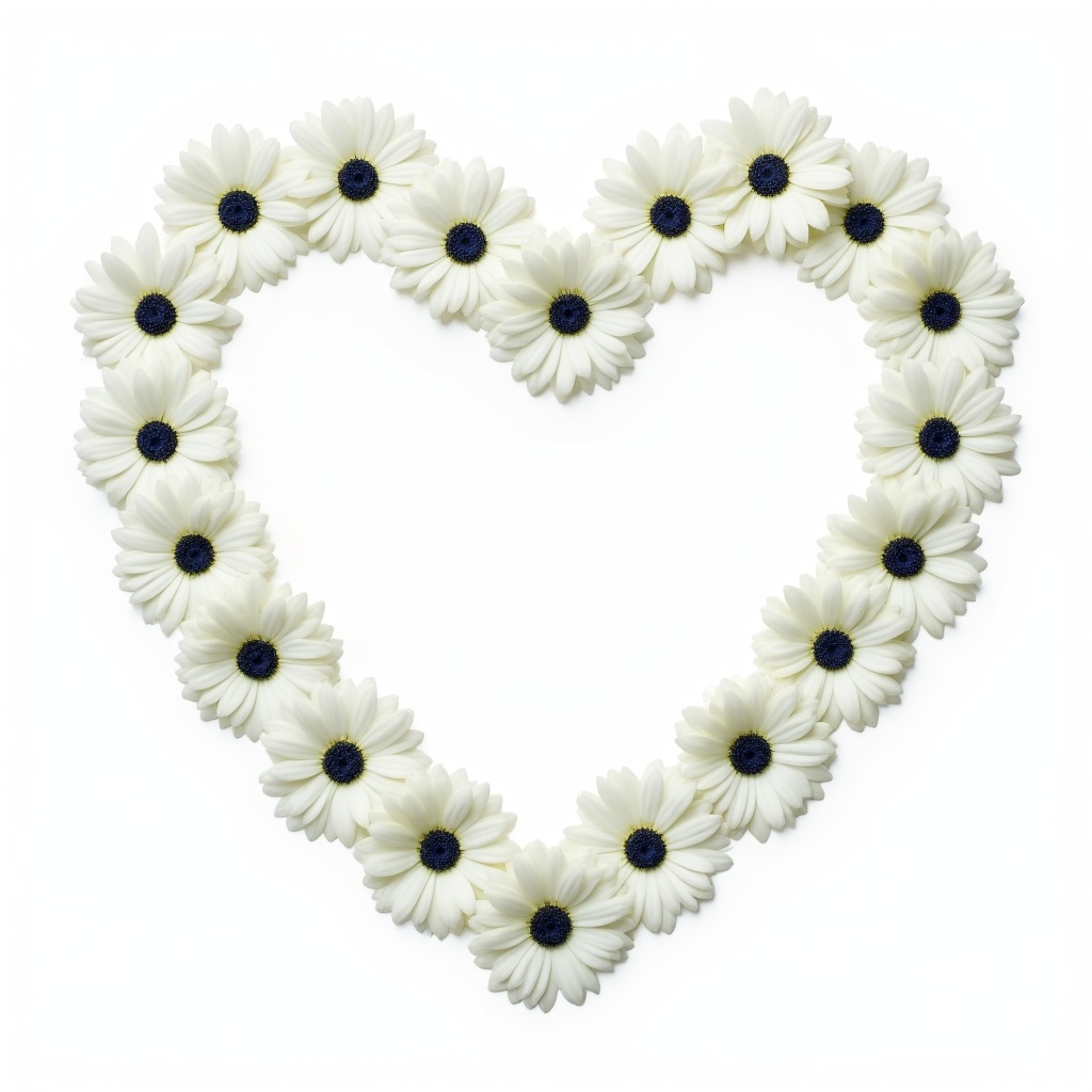 A heart-shaped arrangement of white daisies with black centers is isolated on a white background. The petals are pristine white and form a perfect heart outline. Each daisy is neatly positioned to create the romantic shape.