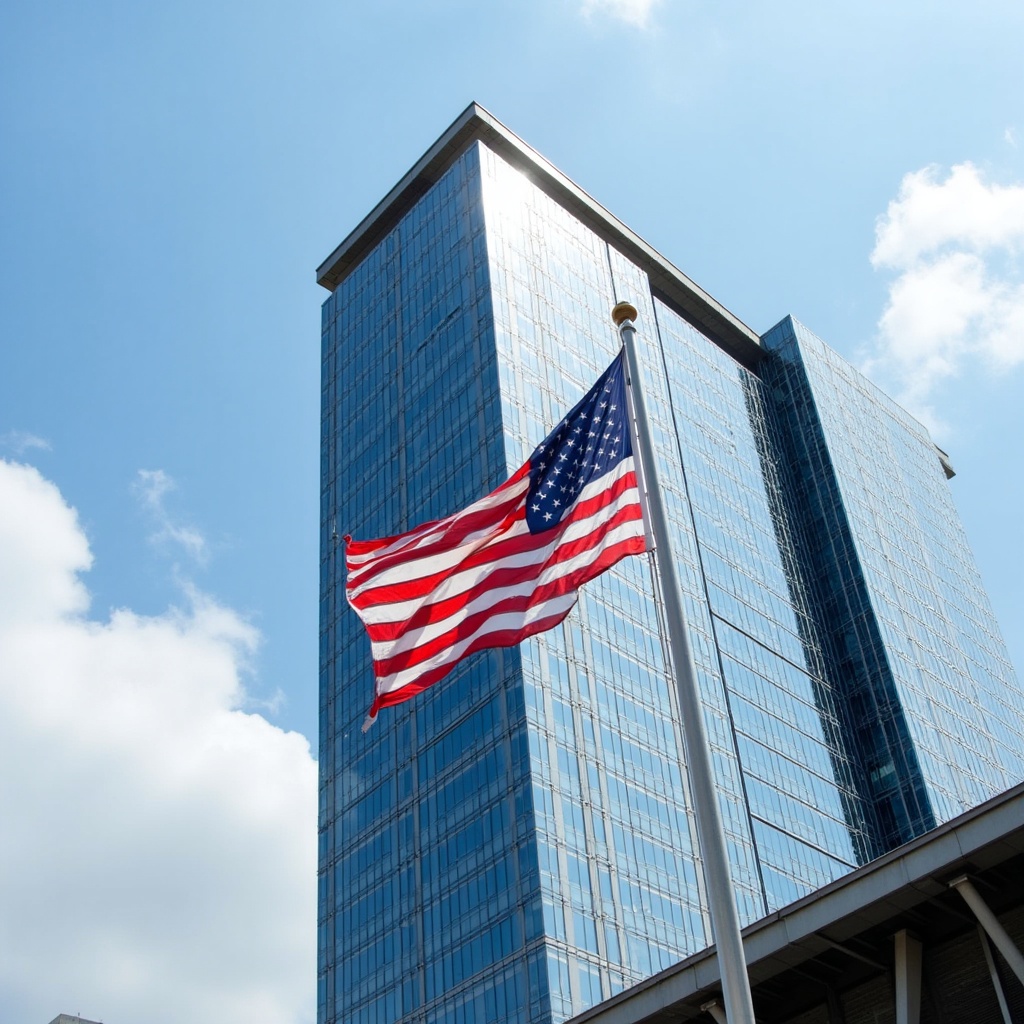 USA flag, blue glass building, clear sky, clouds, flag flying, flagpole, high-rise buildings, modern architecture, red white blue, skyscrapers, stars and stripes, tall buildings, urban skyline, waving flag, American flag