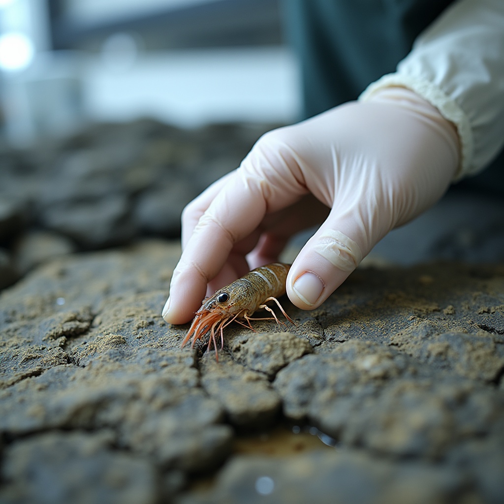 A hand wearing white latex gloves gently holds a small live shrimp on a textured rocky surface. The shrimp has a translucent body, orange legs, and long antennae. The background shows a blurred aquatic or lab environment with greenish tones.