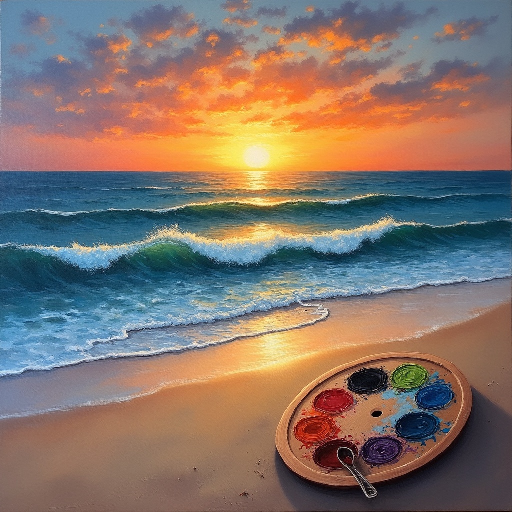 A vibrant oil painting depicts a colorful artist's palette with paintbrush lying on sandy beach. Gentle waves lap at the shore under a brilliant orange sunset sky. The sun reflects on the ocean water, creating a serene coastal scene.