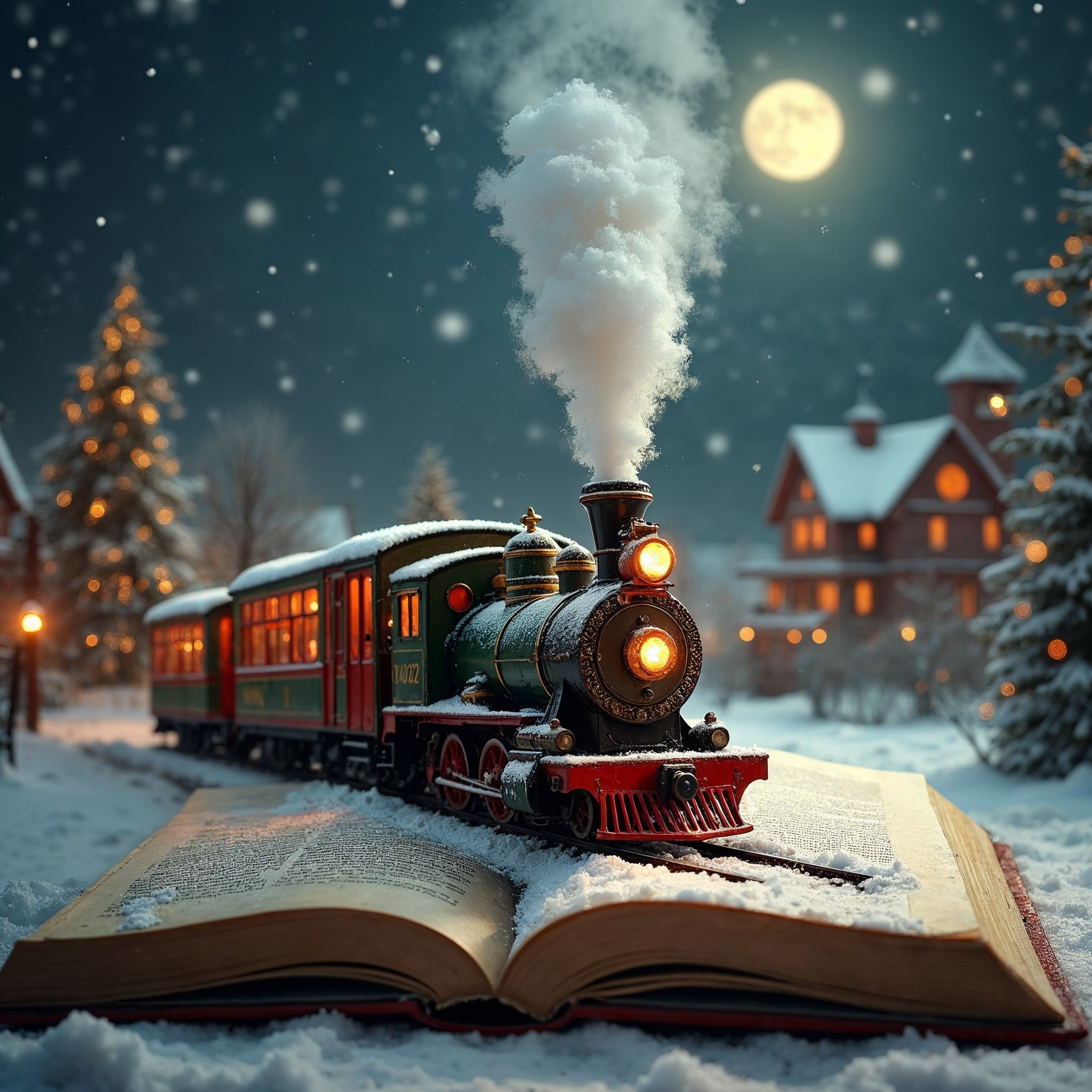 A detailed toy steam train with green and red cars travels across an enormous open book in a snowy winter scene. Fluffy white steam billows from the locomotive's stack under a full moon, surrounded by twinkling Christmas trees and snow-covered cottages. Warm lights glow from the train windows and nearby lanterns.