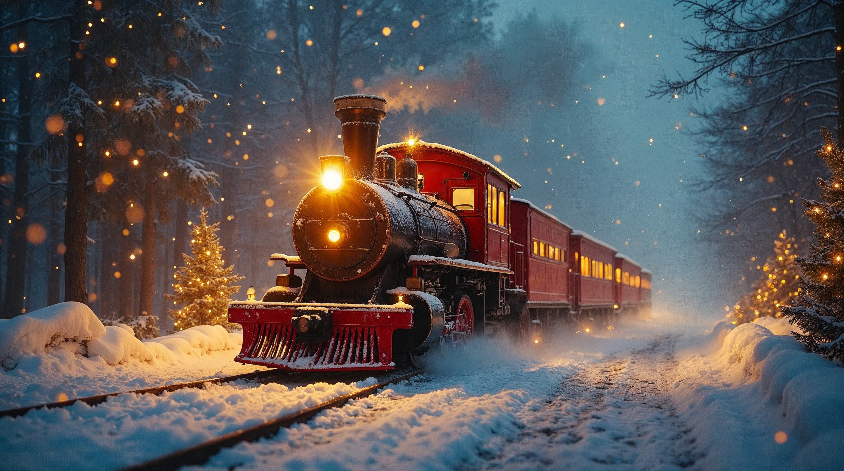A vibrant red steam locomotive with a black engine chugs through a snowy forest path at night. Snowflakes fall gently around the train, illuminated by its bright headlight and festive lights on nearby pine trees. Steam billows from the chimney as it moves along the snow-covered tracks lined with evergreen trees.