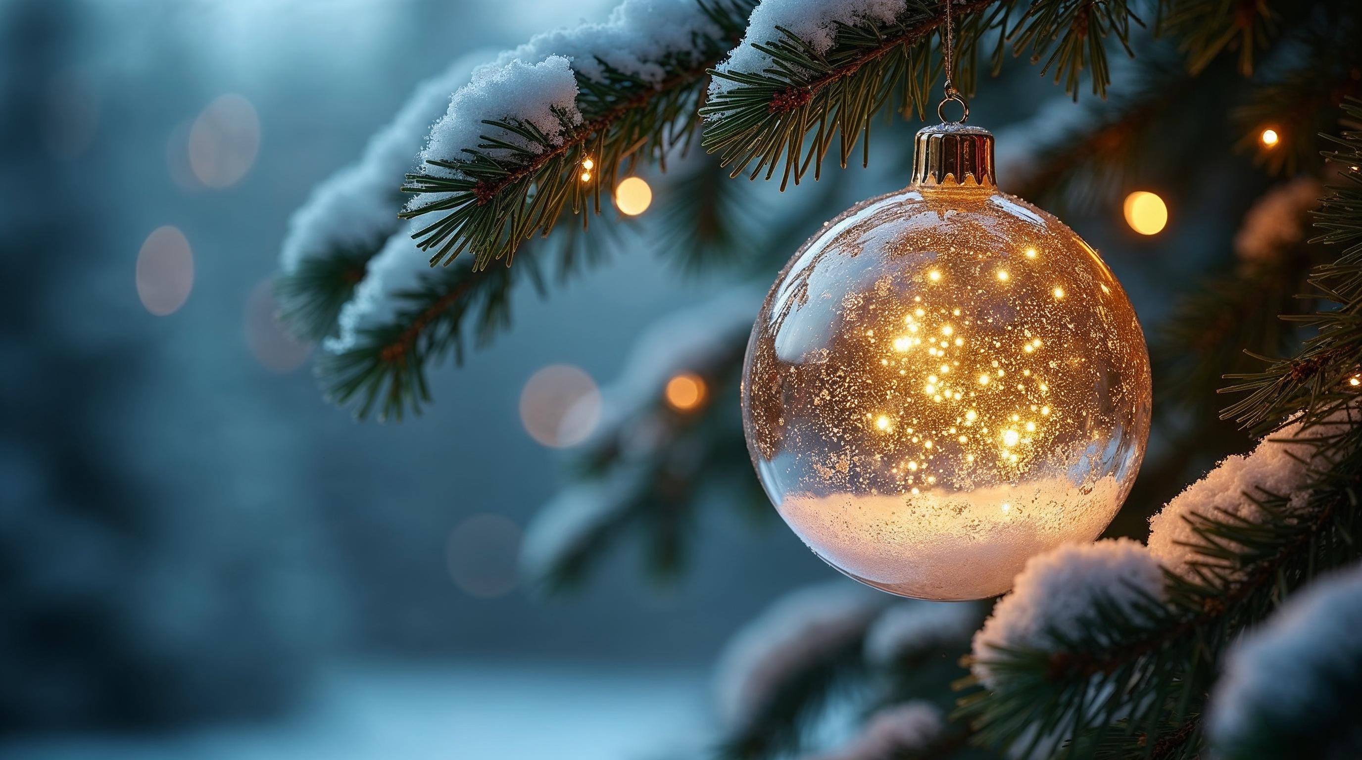 A golden glass Christmas bauble filled with sparkling lights hangs from a snowy fir tree branch. Snow dusts the needles, and soft bokeh lights glow in the blurred blue background. The ornament has a shiny gold cap and reflects warm holiday illumination.
