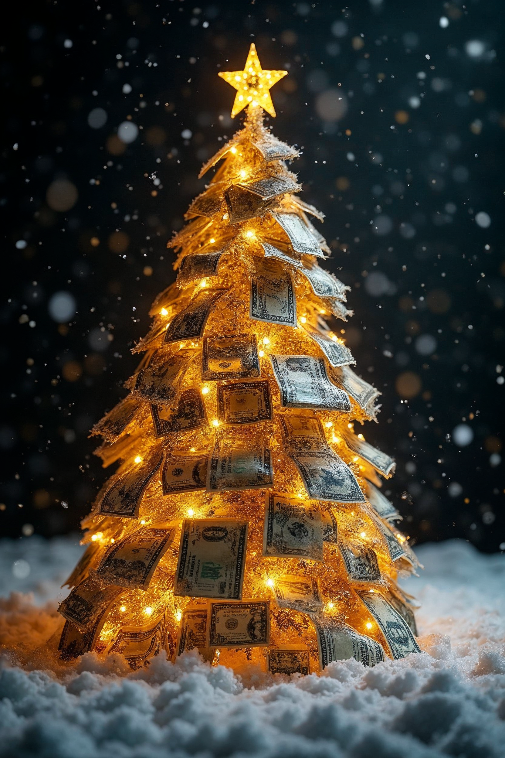 A Christmas tree made entirely of U.S. dollar bills glows with warm lights on a snowy base. A golden star tops the tree, surrounded by sparkling bokeh effects on a dark background. The bills are layered to form the tree's branches and trunk.