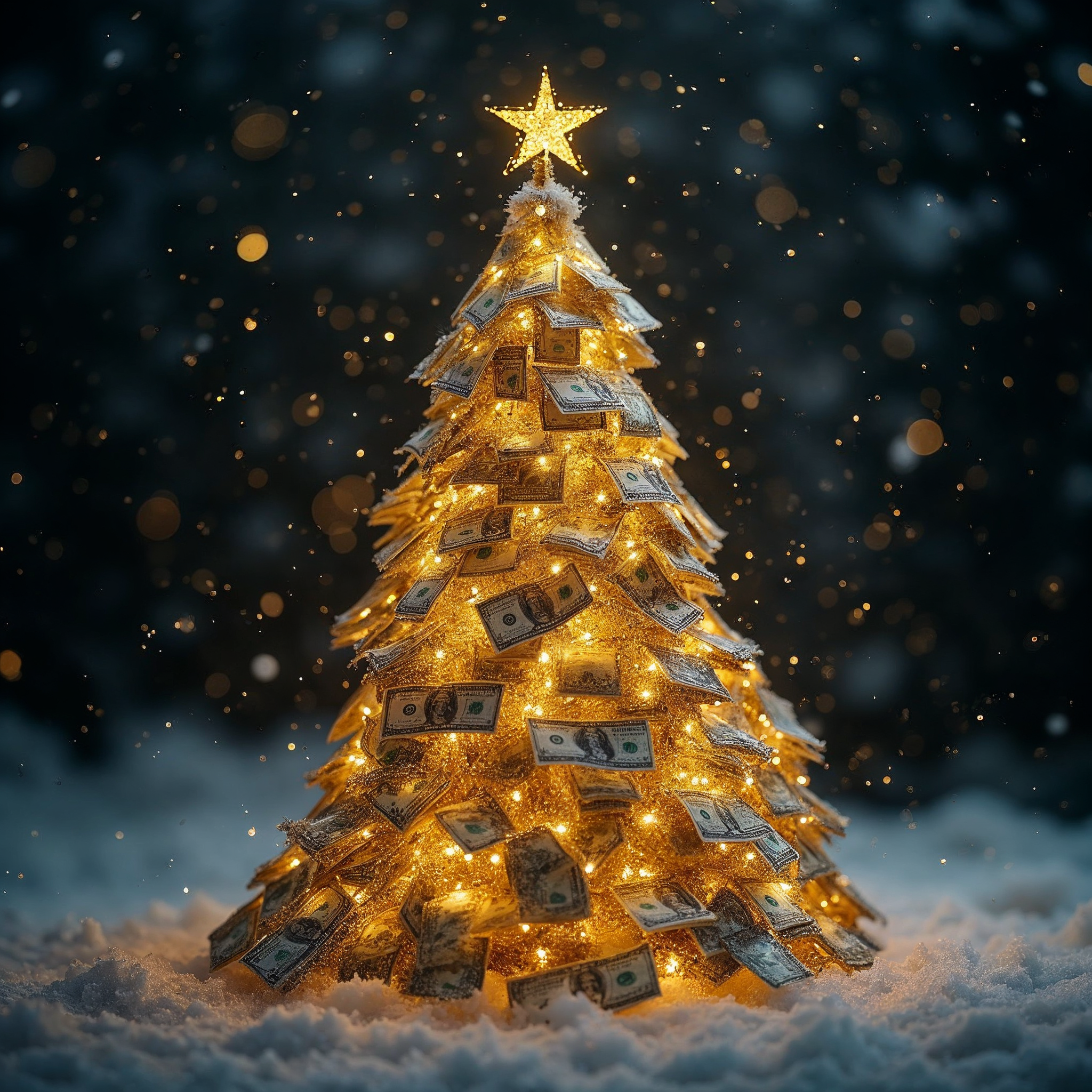 A Christmas tree made entirely of U.S. dollar bills glows with golden lights against a dark snowy background. Snowflakes fall around the tree, which stands on a snowy base with sparkling bokeh effects. The tree is topped with a golden star.