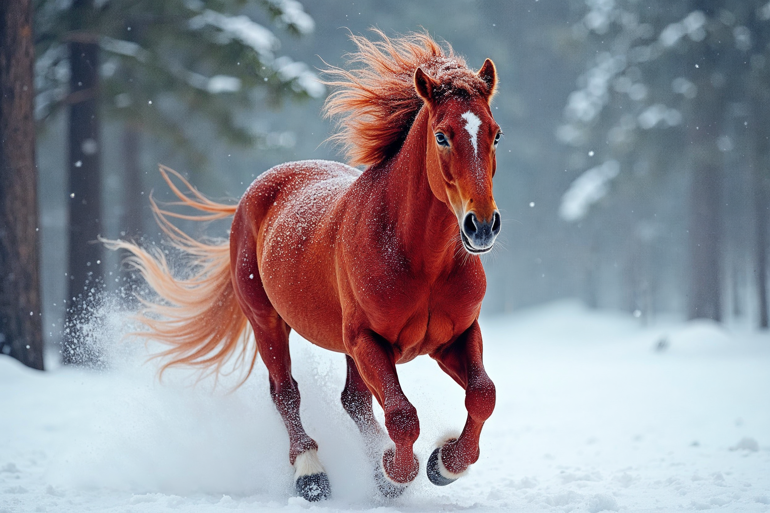 A chestnut red horse with a flowing mane gallops dynamically through a snowy forest. Snow kicks up from its hooves as it runs past evergreen trees covered in white powder. The horse has a white blaze on its face and wears no tack.