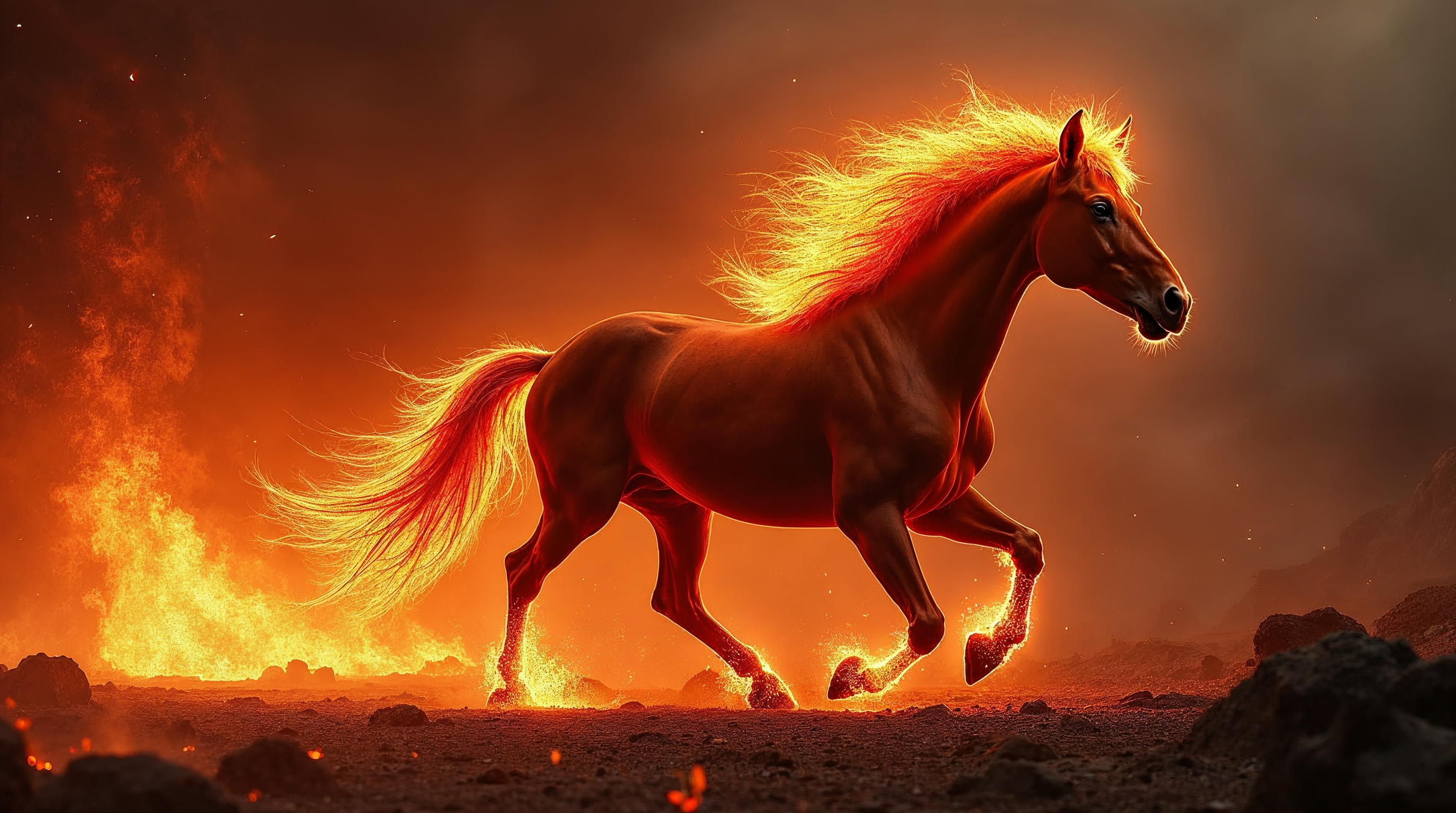 A majestic red horse with flowing fiery mane and tail gallops dynamically across a rocky terrain surrounded by intense flames. Its glowing body and flames create a dramatic, ethereal effect against a dark, smoky background. The horse's muscles are tensed in motion, with sparks and fire trailing behind its hooves.