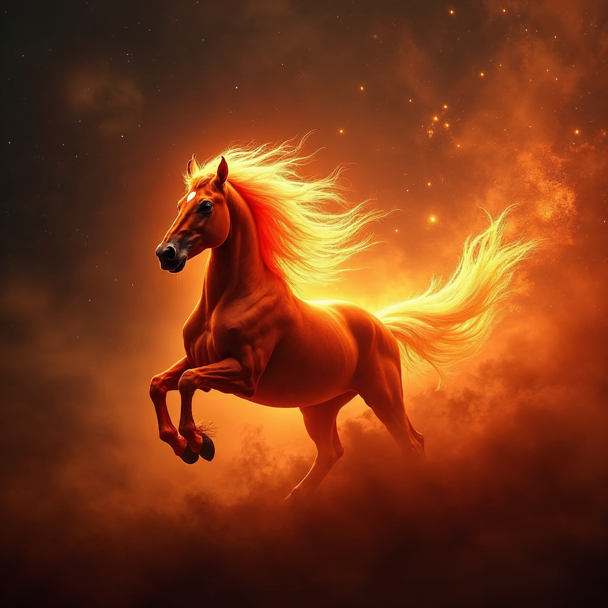 cosmic background, digital art, dynamic pose, ethereal clouds, fantasy horse, fiery horse, fire mane, flames, glowing horse, illustration, isolated background, majestic animal, orange horse, rearing horse, sparkling particles, stars, horse