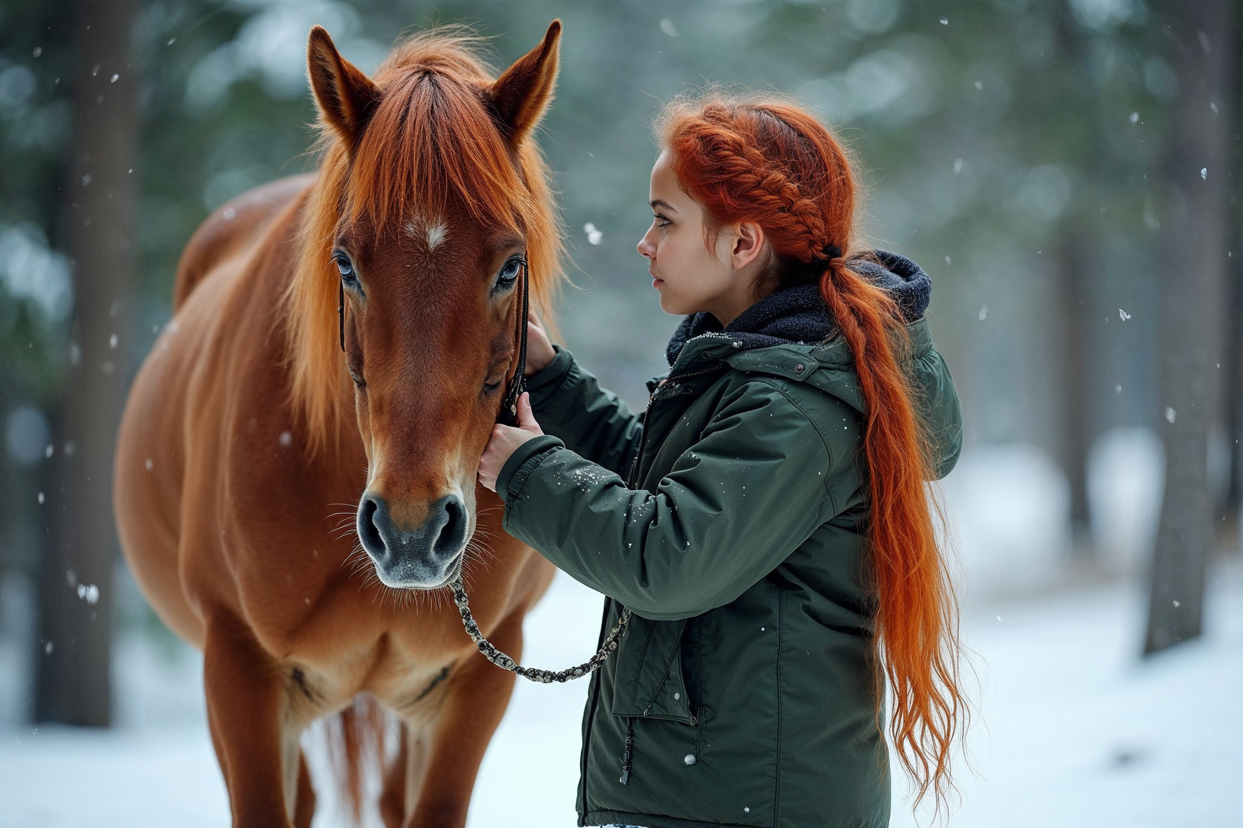 White, animals, braided hair, brown horse, chestnut horse, cold weather, female, forest, girl with horse, green jacket, holding reins, hooded jacket, horse, lead rope, outdoor, red hair, redhead, snow, snowflakes, snowy woods, trees, winter, girl
