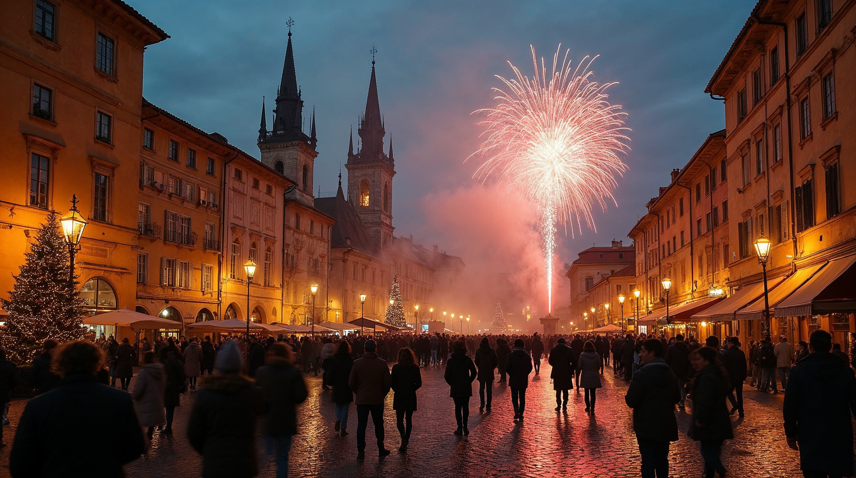 A vibrant fireworks display bursts in red and gold above a historic European square at night. Crowds of people walk along wet cobblestone streets lined with yellow buildings, street lamps, and Christmas trees. Twin-spired church towers stand prominently in the background under a twilight sky.