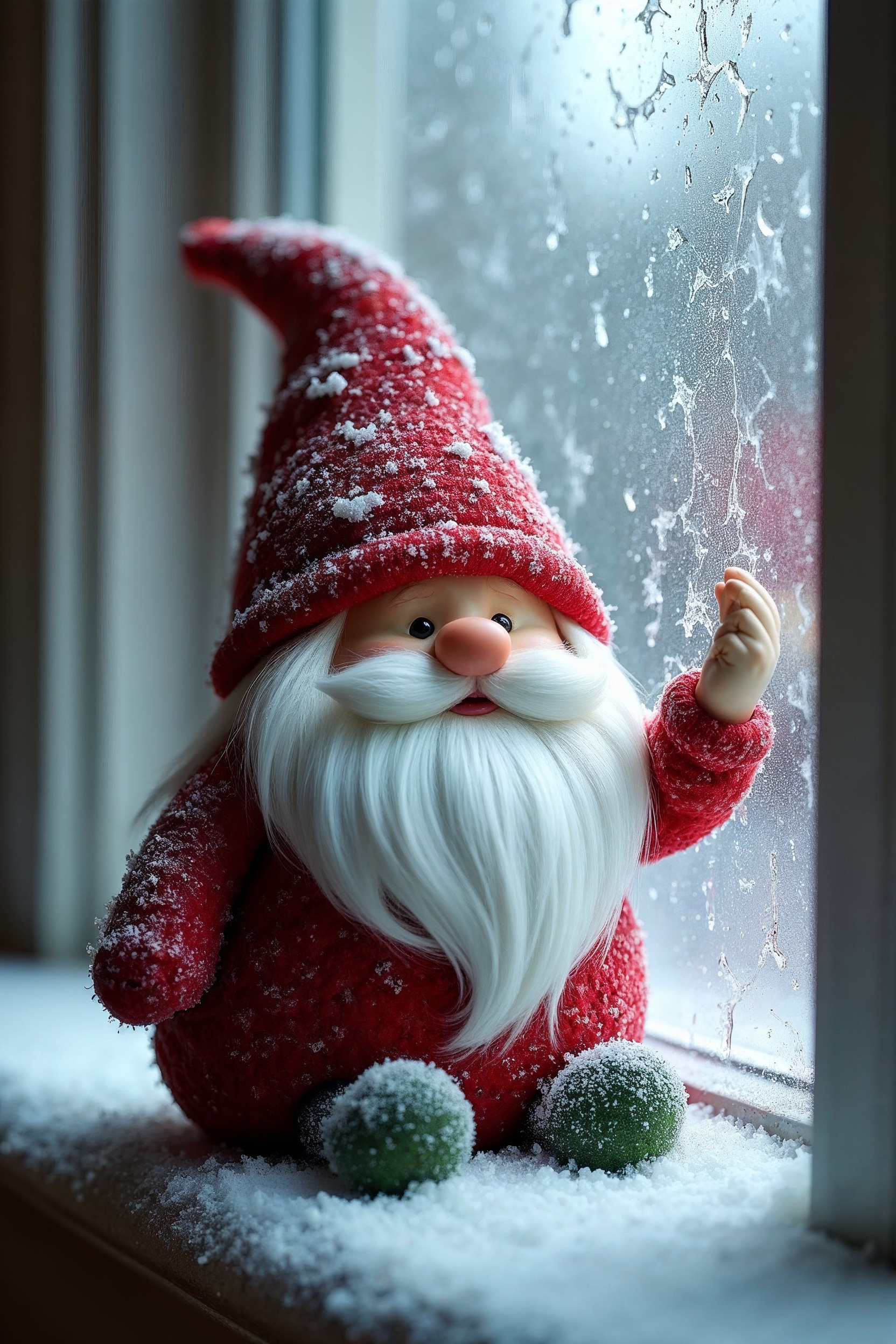 A cute red-hatted gnome with white beard sits on a windowsill covered in snow. Raindrops and streaks cover the window glass behind him. He raises one hand in a waving gesture while wearing green shoes.