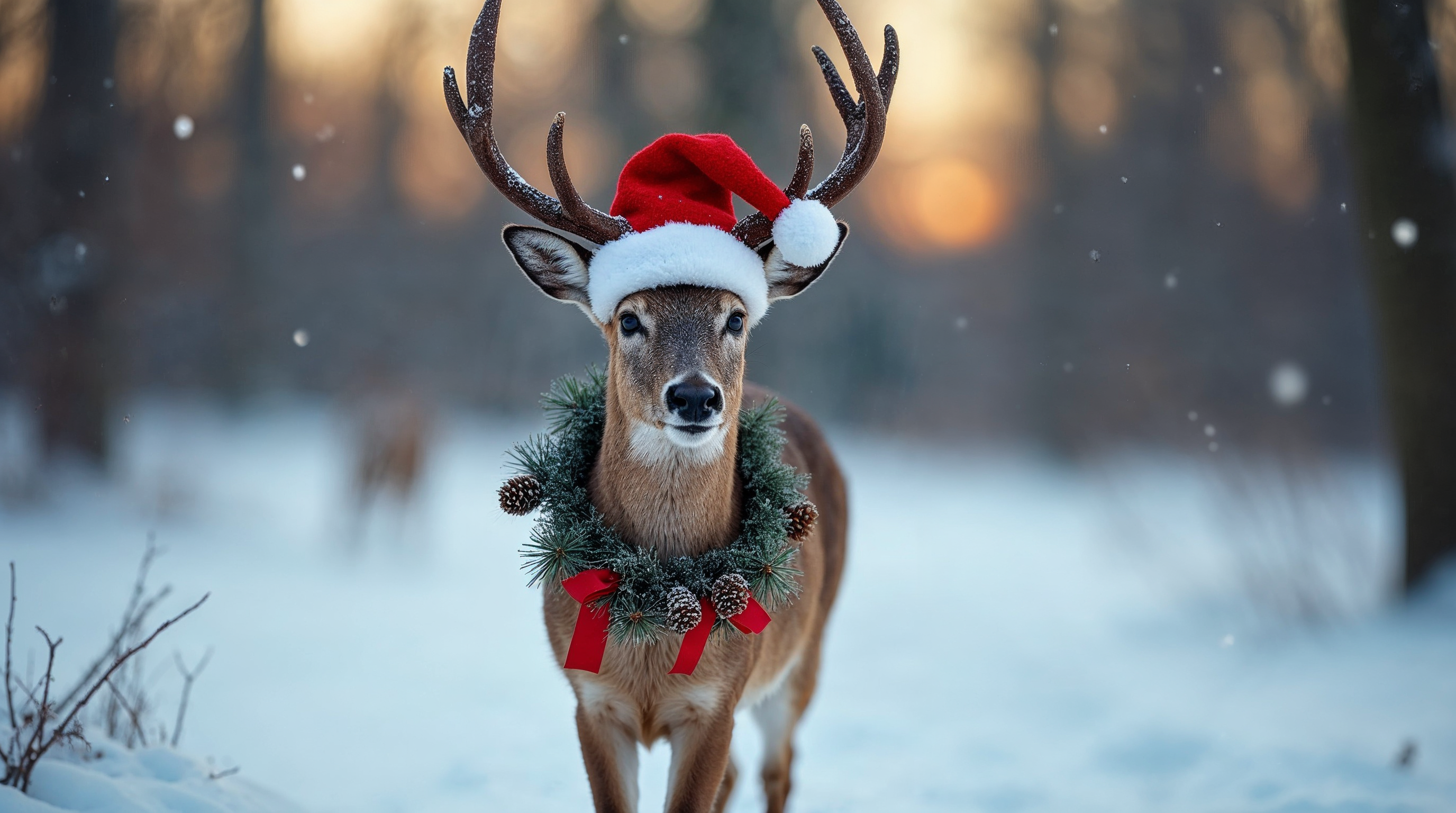 A reindeer stands in a snowy forest wearing a red Santa hat with white trim and a green pine wreath with red bow around its neck. Snowflakes fall gently around it, with trees and sunset light in the background. Its antlers are prominent and snow-dusted.