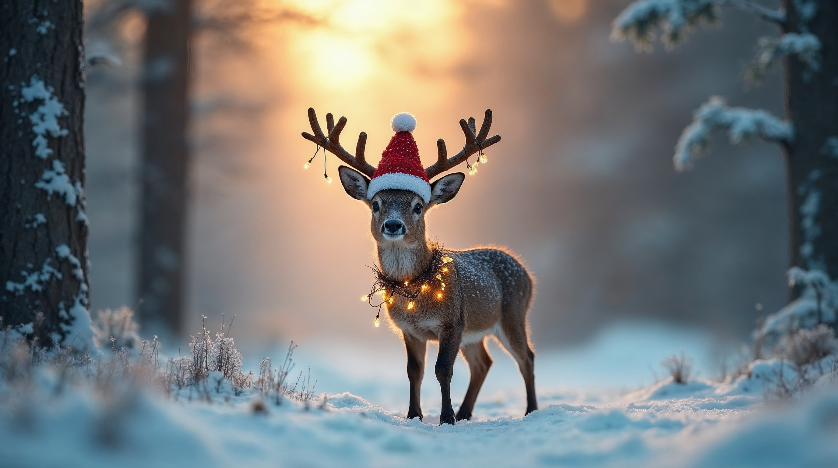 A cute reindeer with large antlers wears a red Santa hat with white pom-pom and twinkling Christmas lights around its neck. It stands in a snowy forest during sunset, surrounded by snow-covered trees and ground. The warm golden sunlight filters through the winter landscape.