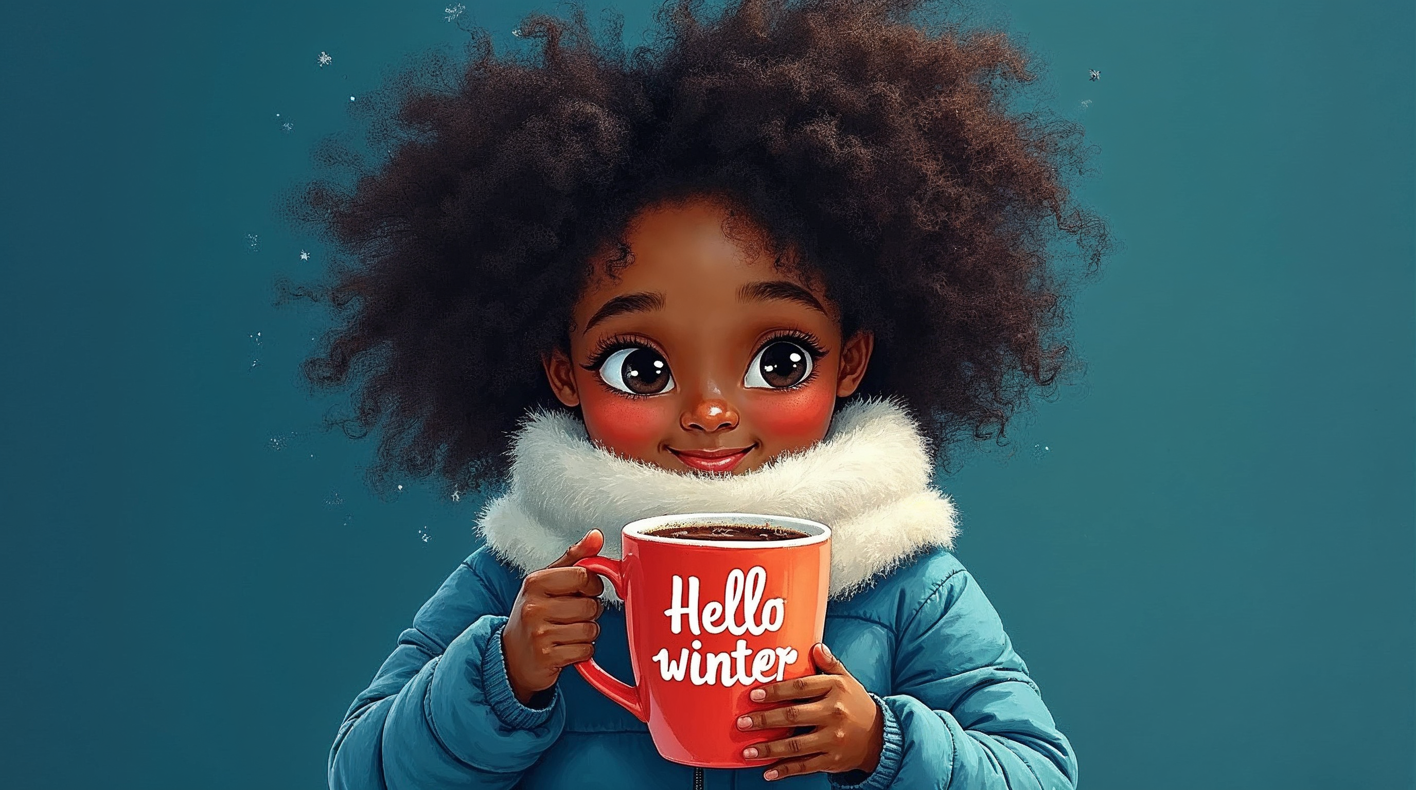 African-American, Hello mug, beverage, black hair, blue coat, cold weather, curly hair, cute girl, digital art, fur scarf, holding mug, hot drink, illustration, large eyes, portrait, red mug, rosy cheeks, smiling girl, snowflakes, teal background, winter, winter coat, young girl, girl