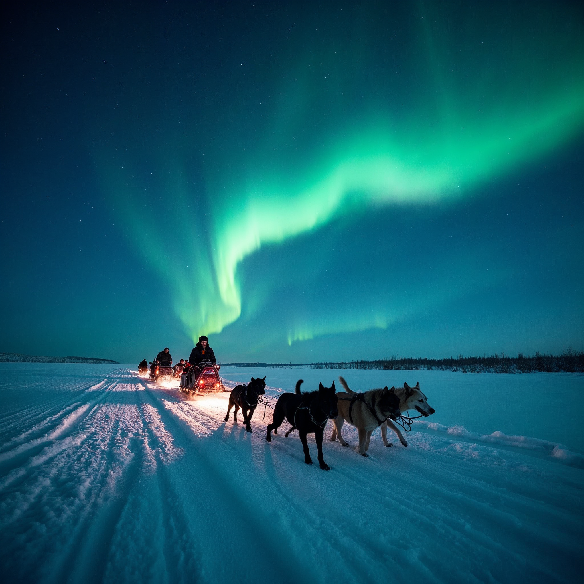A team of sled dogs pulls a snowmobile on a snowy trail at night, with a vibrant green aurora borealis illuminating the sky. A person in winter gear drives the snowmobile, followed by more dogs and another rider in the distance. The scene features a flat snowy landscape under the starry Arctic night.