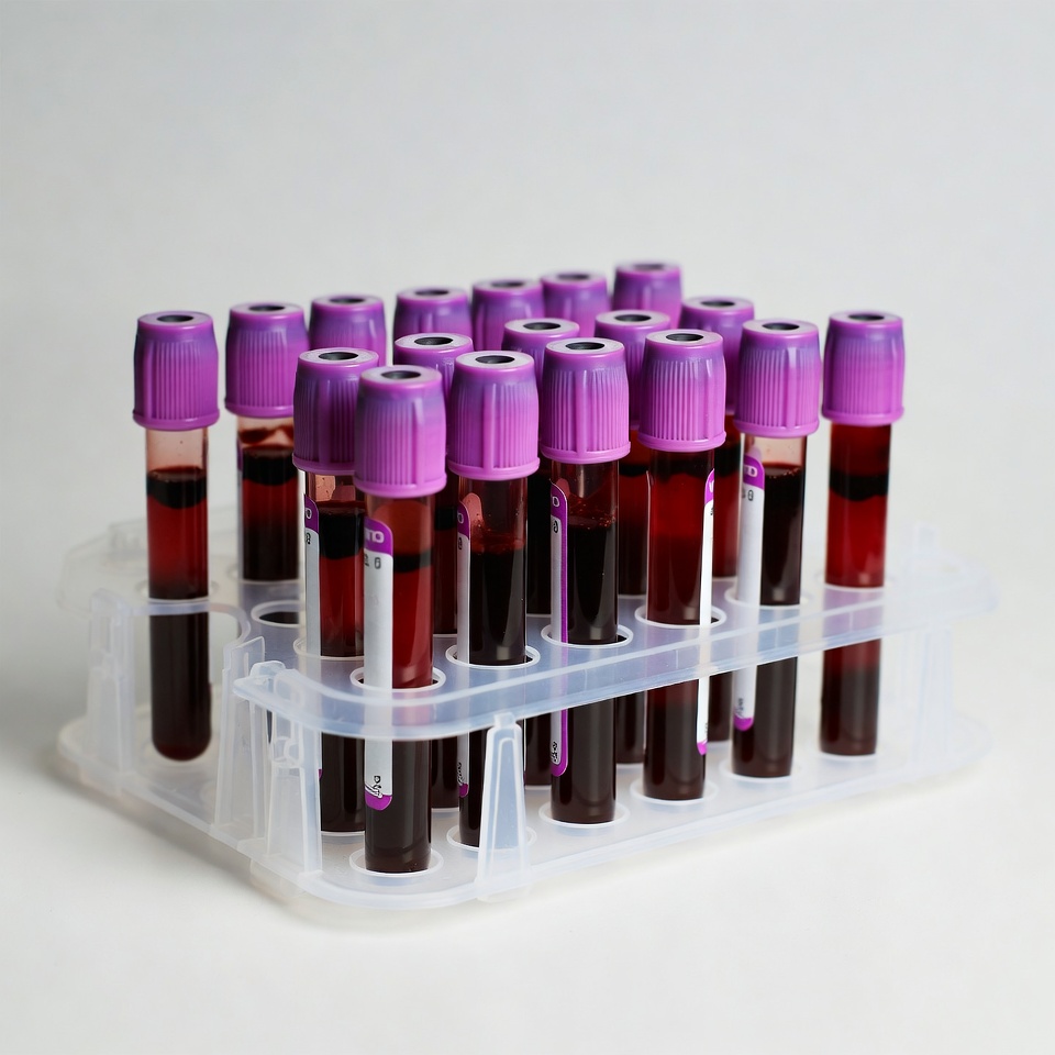 A clear plastic rack holds multiple purple-topped blood collection tubes filled with red blood samples. The tubes are arranged in rows on a white background. Some tubes contain clear liquid while others have dark red blood.