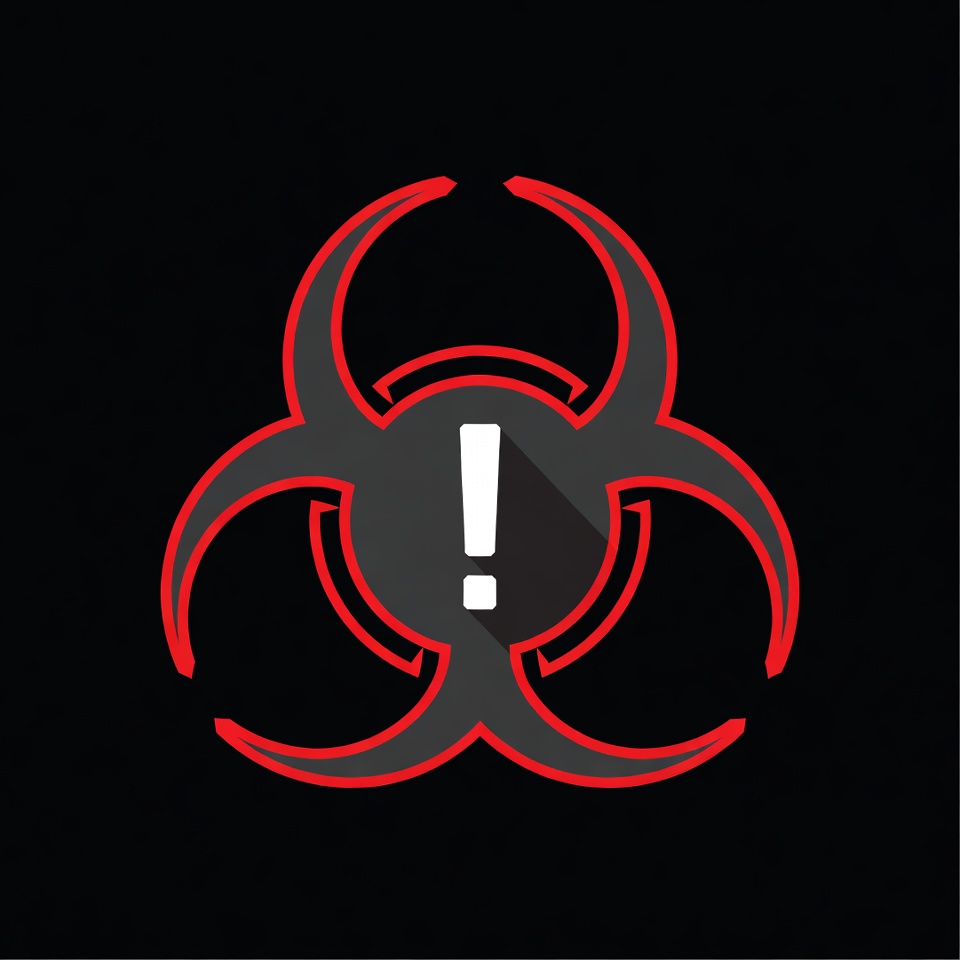 A red-outlined black biohazard symbol features a white exclamation mark in its center circle. The design is flat and illustrated against a solid black background. The trefoil shape has sharp, glowing red edges.