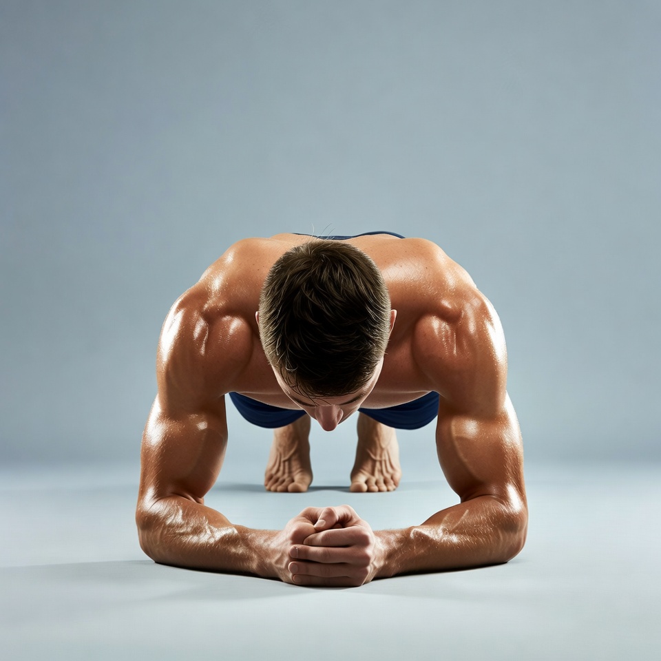 A muscular man with short brown hair performs a plank exercise on a gray studio floor. He is shirtless, wearing blue shorts, with his body tensed and hands clasped in front. His back and arms show defined muscles against the plain background.