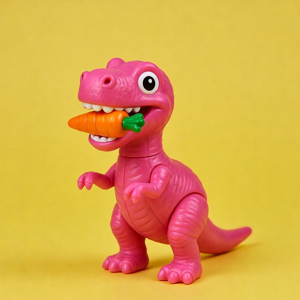 A cute pink plastic T-Rex dinosaur toy with big eyes holds a green-topped orange carrot in its mouth. It stands on a bright yellow background with sharp white teeth visible. The toy has a playful pose with short arms extended.