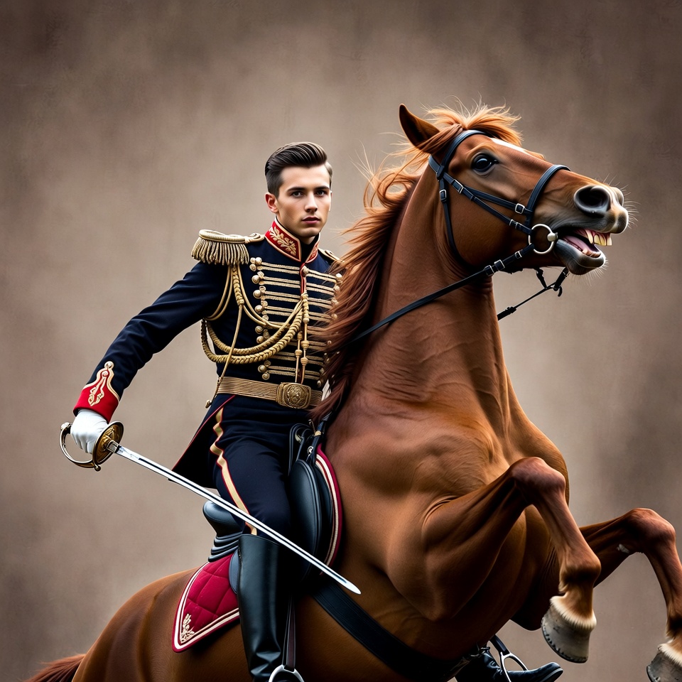 A young man in an elaborate military uniform with gold braiding and red accents rides a brown horse that is rearing up on its hind legs. He holds a sword in his gloved right hand and grips the reins firmly. The scene is set against a neutral brown background.