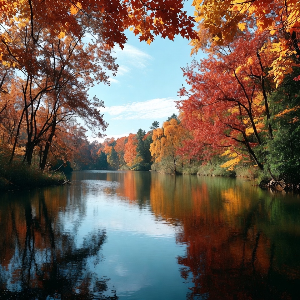 Vibrant autumn trees with red, orange, and yellow leaves frame a calm lake. The water perfectly mirrors the colorful foliage and blue sky above. Bare branches and evergreen trees add contrast along the shoreline.