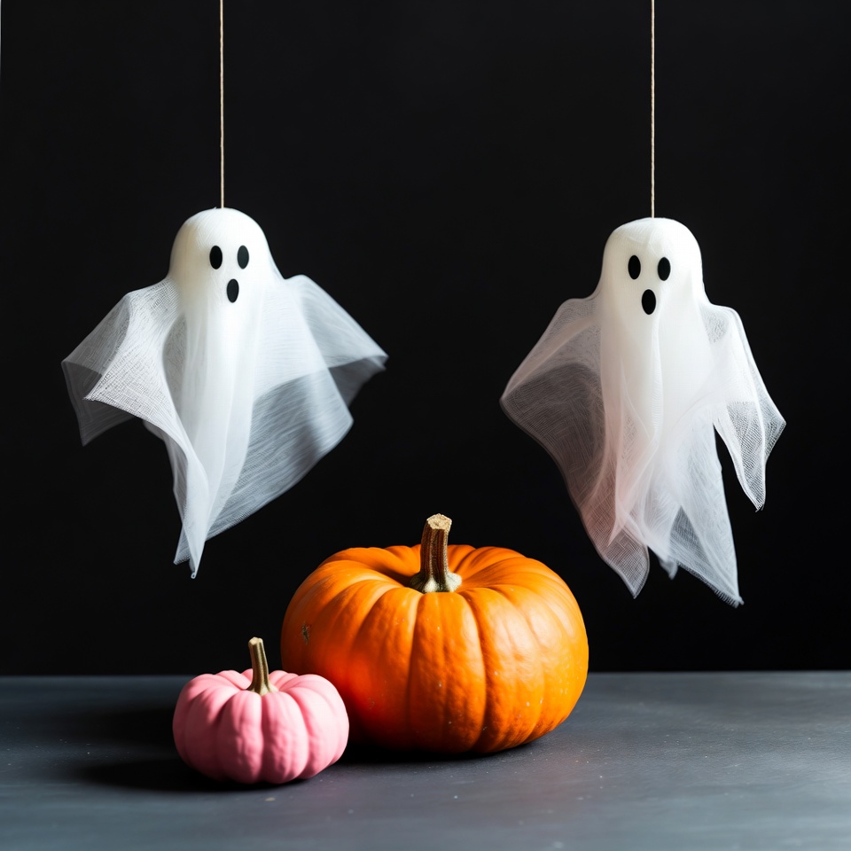 Two white fabric ghosts with black eyes hang from strings above two pumpkins on a dark surface. One pumpkin is large and orange, the other small and pinkish. The scene features a black background, perfect for Halloween decor.