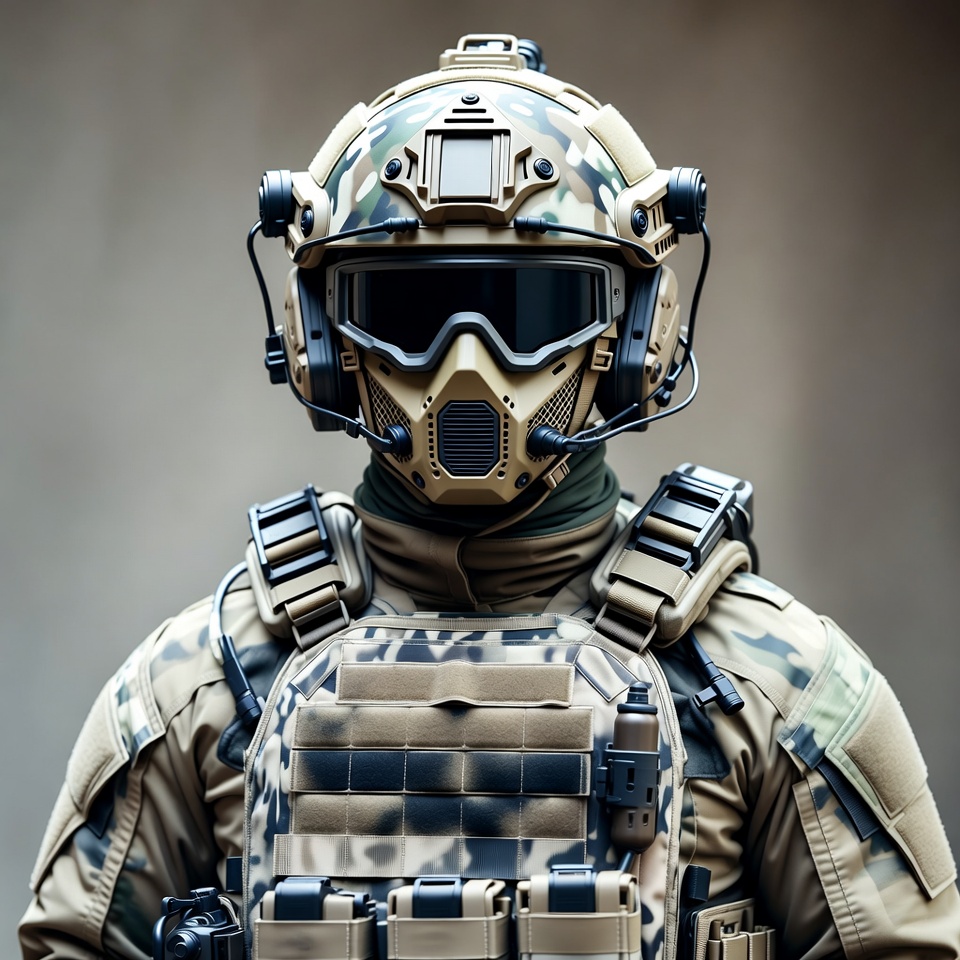A soldier wearing a full-face tactical helmet with night vision goggles and a respirator mask stands frontally. He is dressed in camouflage body armor, straps, and pouches over military fatigues. The image features a neutral gray background.
