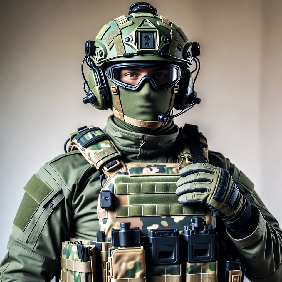 A male soldier stands in full tactical gear against a plain background. He wears a green helmet with night vision goggles, a balaclava covering his face, and camouflage uniform with plate carrier and pouches. His gloves hold gear securely, and he has communication headset attached.