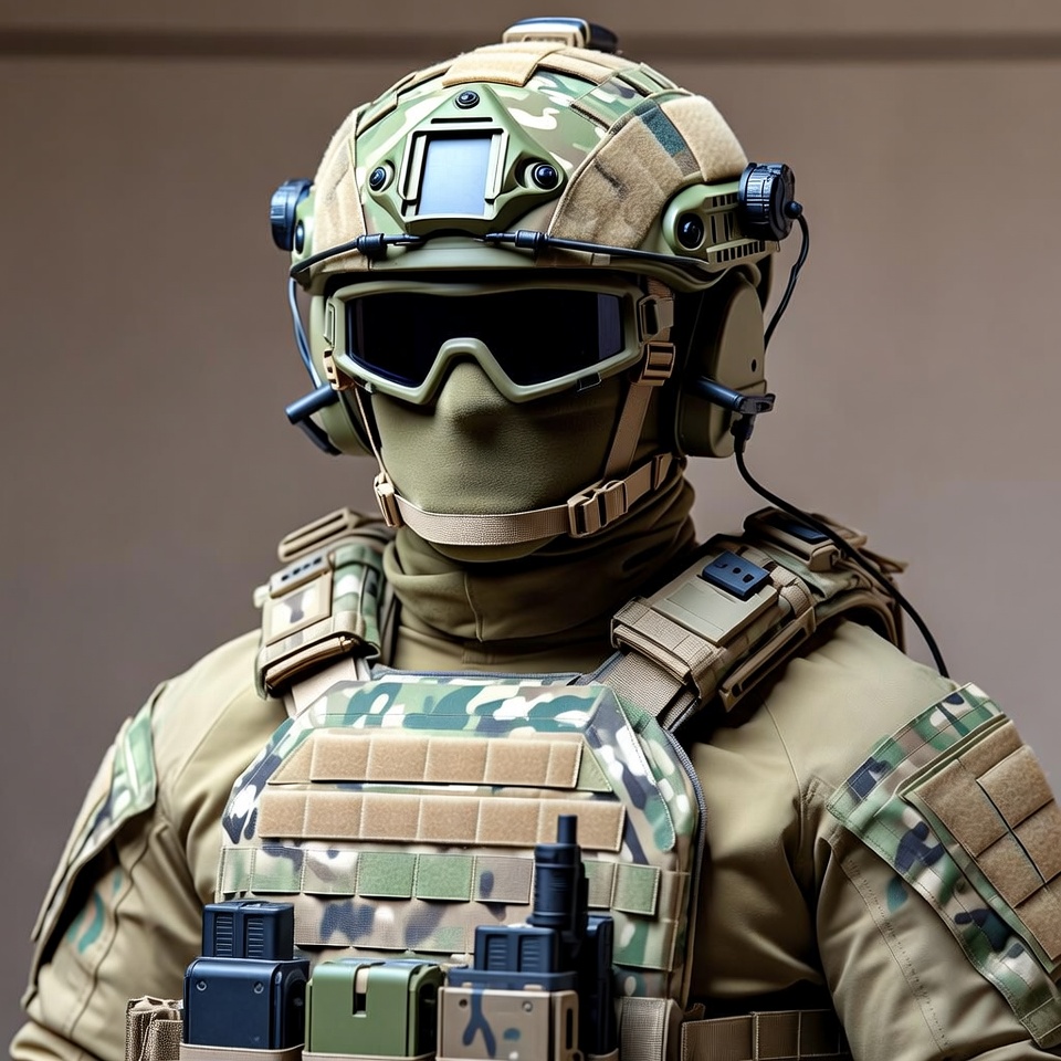 A soldier stands in full tactical gear with a camouflage helmet featuring night vision goggles and a visor. He wears a balaclava mask, protective vest with pouches, and radio equipment over camouflage uniform. The figure is posed against a plain white background.