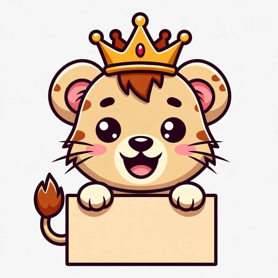 animal, animals, baby lion, big eyes, blank sign, brown lion, cartoon lion, clipart, crown, cute lion, golden crown, happy lion, holding sign, illustration, isolated background, kawaii lion, lion cub, paws, spotted fur, vector art, lion