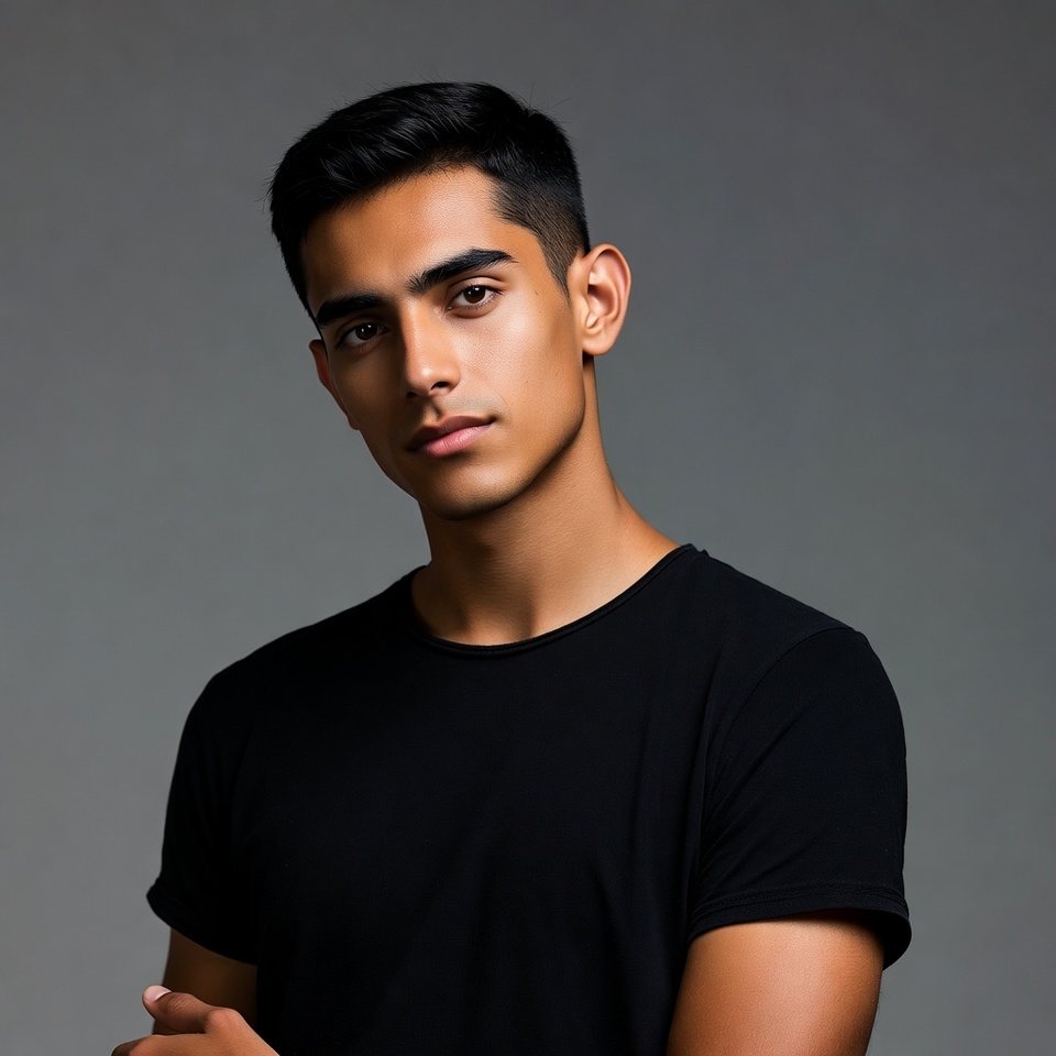 A young man with short black hair and brown eyes stands against a gray background. He wears a fitted black t-shirt and gazes slightly to the side with a subtle expression. His arms are crossed casually at the front.
