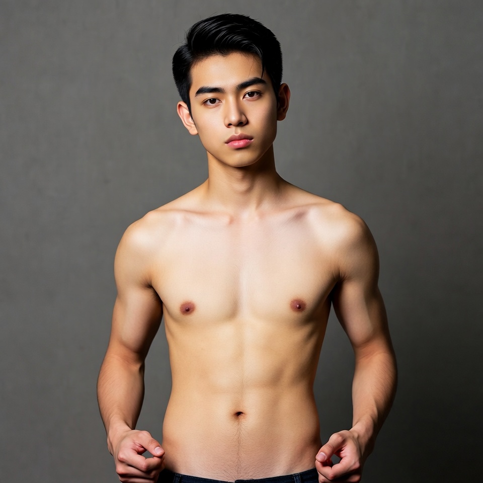 A young Asian man with short black hair stands shirtless against a gray background. He has a muscular build with defined abs and arms, wearing low-waisted pants. He poses confidently with hands near his waist.