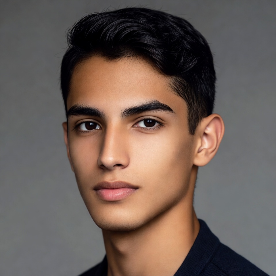 A young man with smooth brown skin and sharp facial features stares directly at the camera. He has neatly styled dark wavy hair and thick eyebrows. He wears a dark shirt against a plain gray background.