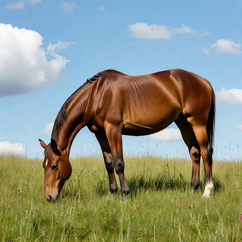 animal, bay horse, blue sky, brown horse, clouds, equine, field, grass, grazing horse, green field, meadow, nature, outdoors, pasture, sunny day, horse