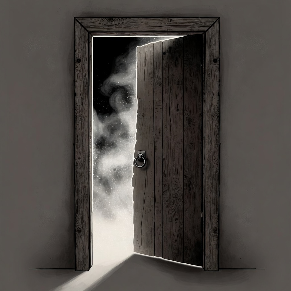 An old wooden door stands open in a framed doorway on a plain background. Thick white mist billows out from the dark interior, glowing with ethereal light. A metal doorknob is visible on the door.