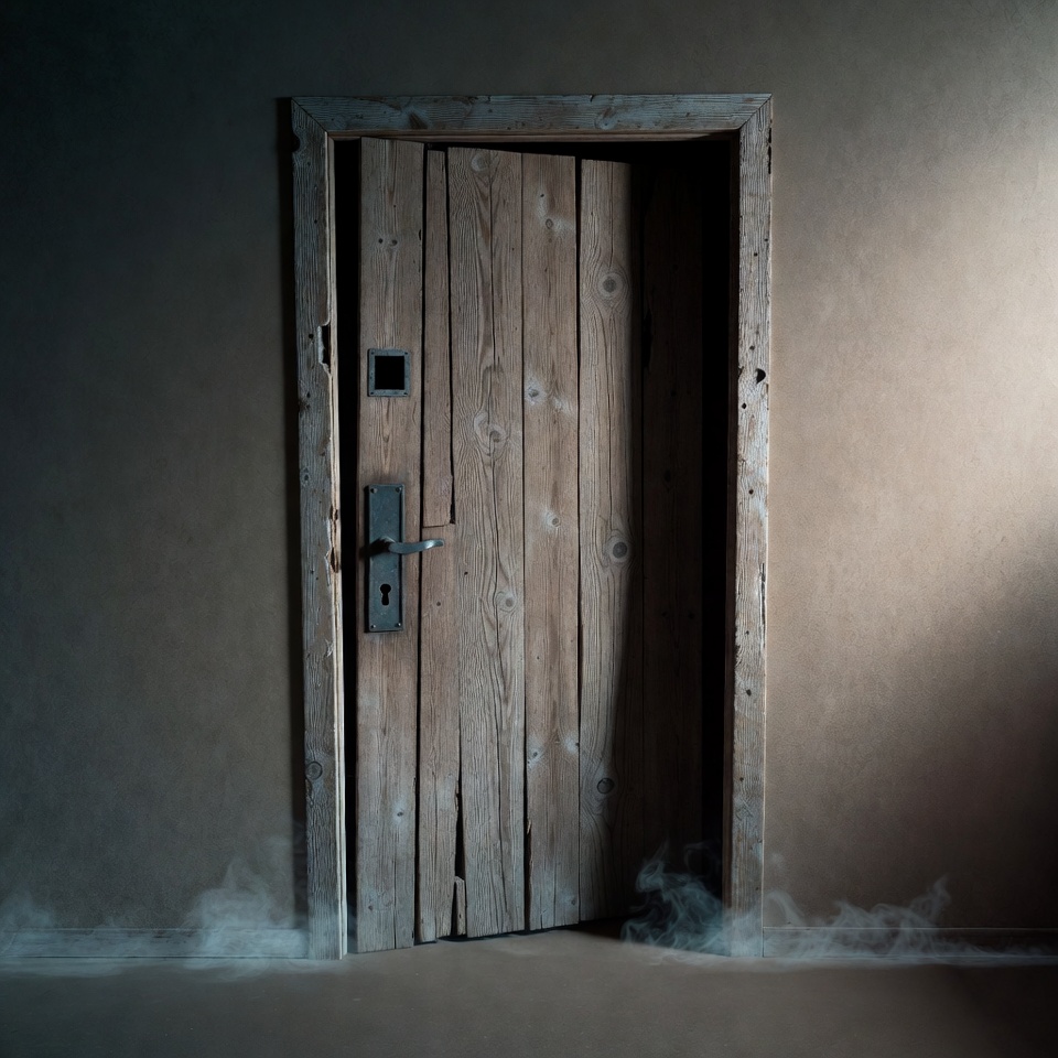 An old wooden door stands ajar in a dimly lit room with a rustic frame and metal handle. Thick fog billows out from the open doorway onto the floor. The scene features soft lighting highlighting the aged wood texture against a plain wall.