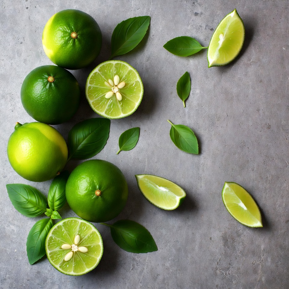 aromatic leaves, basil leaves, citrus fruit, cut limes, flat lay, food photography, fresh herbs, fresh limes, gray background, green basil, green limes, healthy eating, ingredients, kitchen, lime seeds, lime slices, lime wedges, produce, top view, tropical fruit, vegan, whole limes, limes