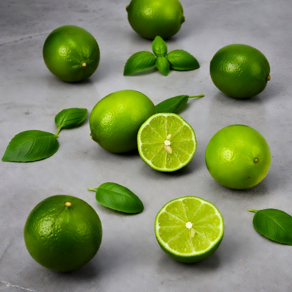 basil leaves, citrus fruit, cut lime, food photography, fresh basil, fresh limes, gray background, green fruits, green limes, halved limes, isolated background, lime halves, lime slices, whole limes, limes