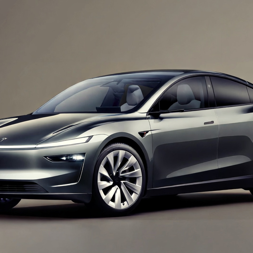 A sleek gray Tesla Model S Plaid electric car is displayed from the front on a neutral background. It features aerodynamic design, distinctive Tesla T logo on the hood, aerodynamic wheels, and slim LED headlights. The interior is visible through the tinted glass windows with light-colored seats.