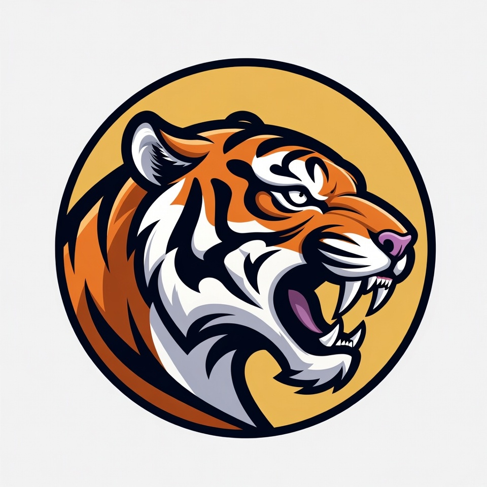 A fierce tiger head with orange fur and black stripes is depicted in a dynamic vector illustration. The tiger roars with mouth open, revealing sharp white fangs, and intense eyes. It is set against a yellow circular background.