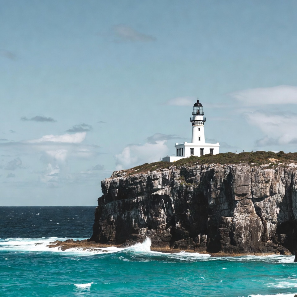 A white lighthouse stands atop a rocky cliff overlooking the turquoise ocean. Waves crash against the base of the cliff under a partly cloudy sky. The structure features a black lantern room and is positioned on a grassy promontory.