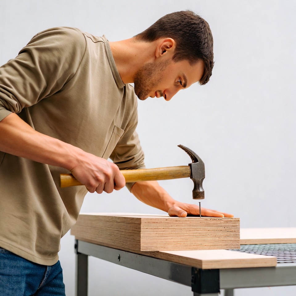 A man with short brown hair and a beard wears a beige long-sleeve shirt and jeans while hammering a nail into a plywood board. He leans forward over a metal workbench with a white background. His expression shows concentration on the task.