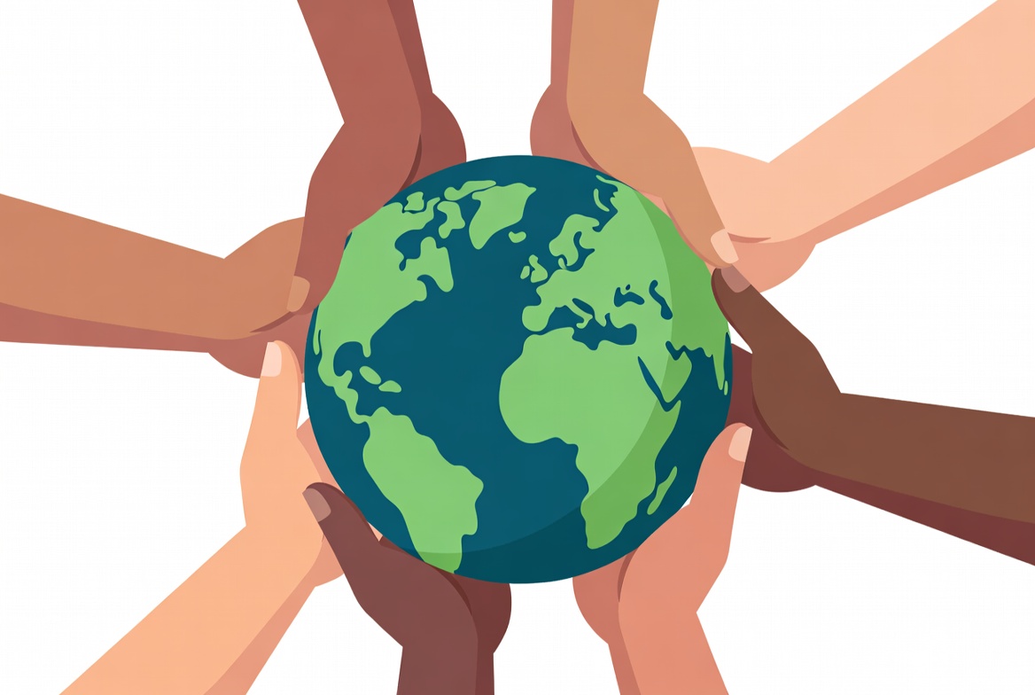 A colorful vector illustration shows diverse hands of various skin tones collectively holding a detailed globe representing Earth. The hands surround the planet from all sides against a white background. The artwork features realistic continental outlines in green and blue hues.