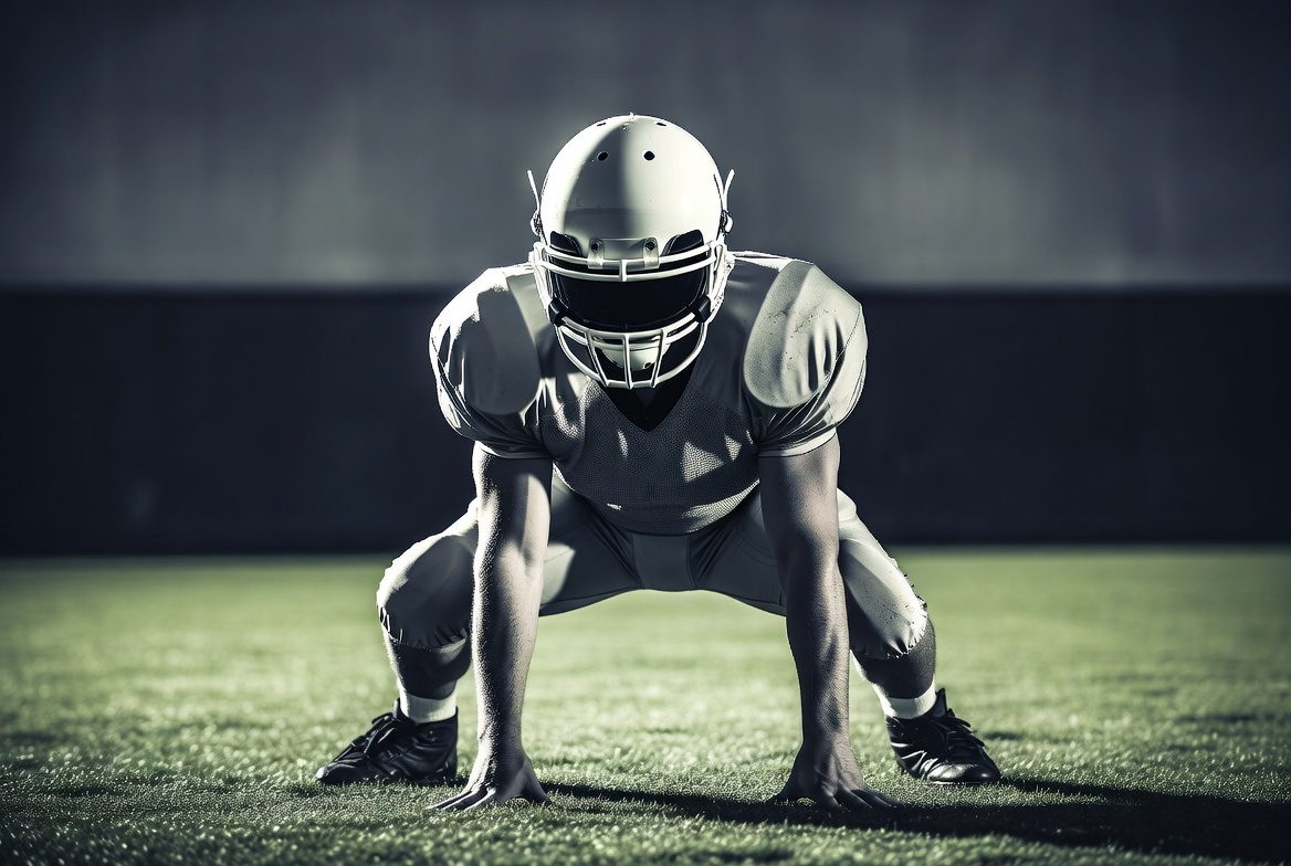 A male football player wearing a white helmet and uniform crouches in a three-point stance on a green turf field. His hands touch the ground as he prepares to start, with a dark stadium background. The image has a dramatic black and white tone with subtle lighting.