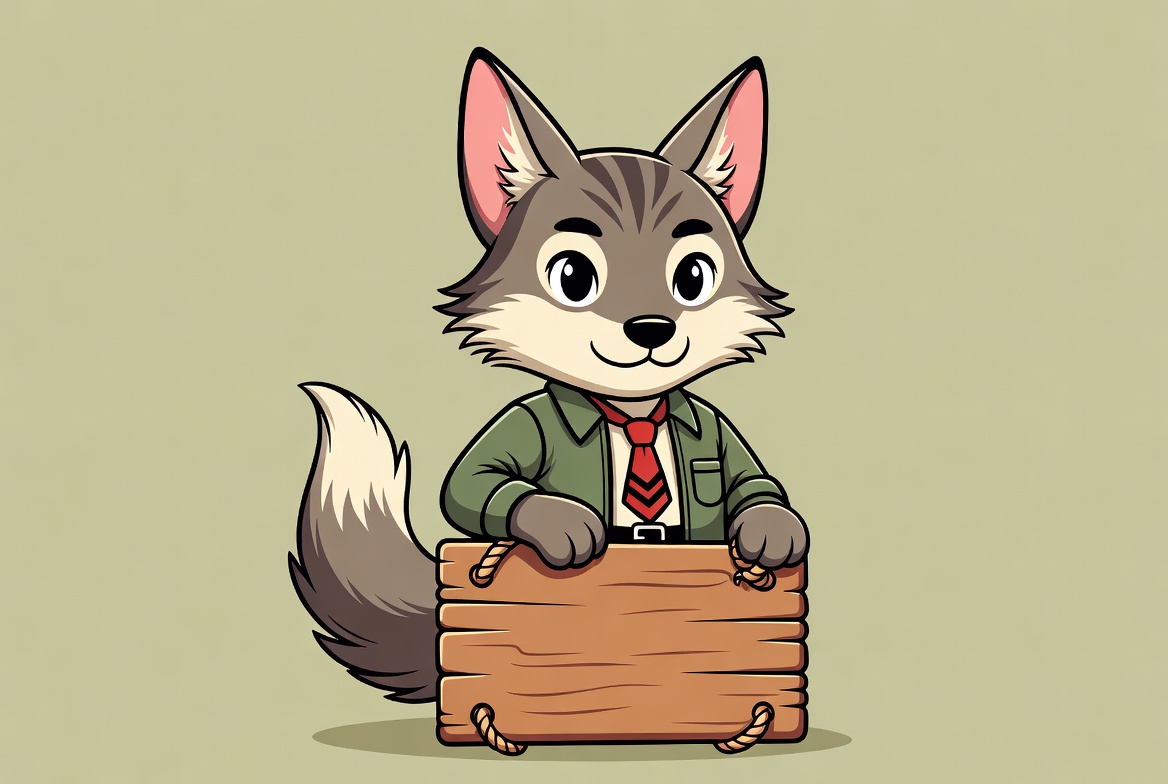 A cute cartoon wolf with gray fur and large expressive eyes stands on a light green background. It wears a green jacket, red tie, and holds a wooden sign with ropes. Its bushy tail is visible behind it.