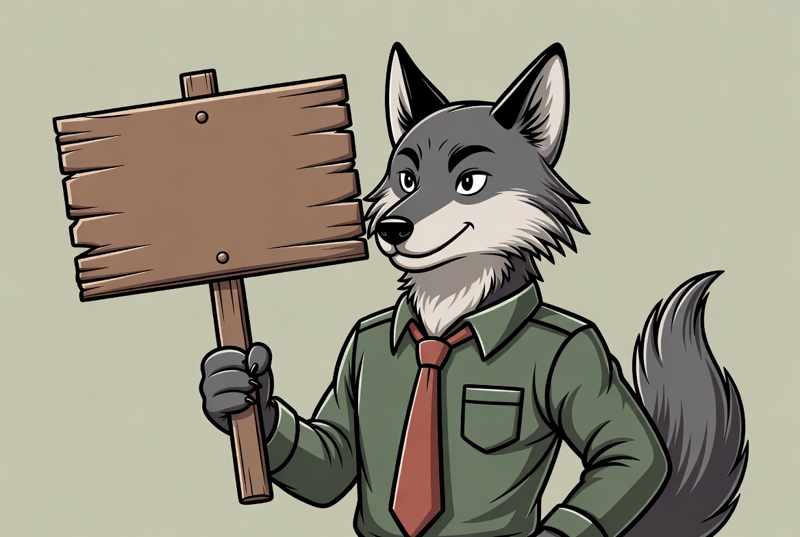 A cartoon anthropomorphic wolf with gray fur holds a large wooden sign with a blank surface. He wears a green collared shirt, red tie, and stands confidently with one paw gripping the sign's handle. The illustration features a light green background.
