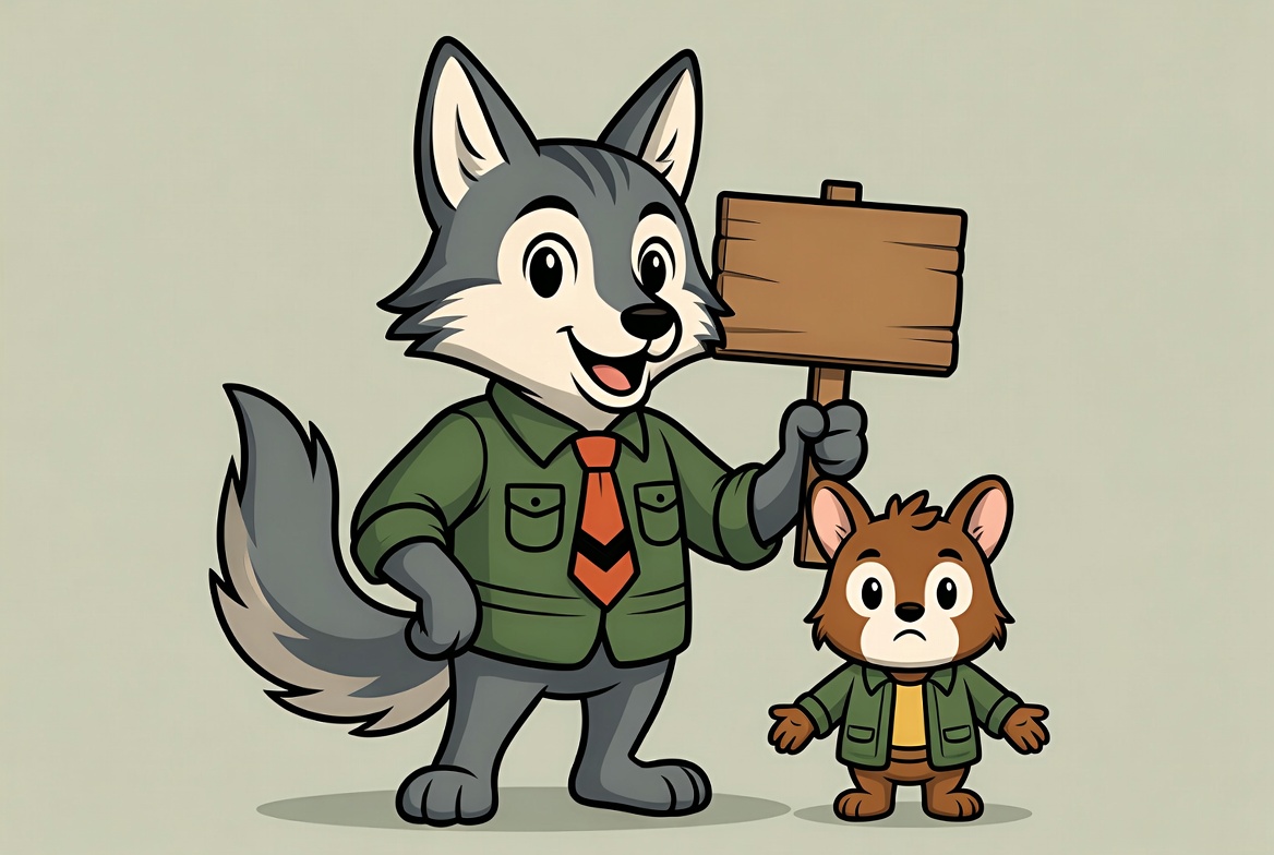 A tall anthropomorphic gray wolf in a green suit and red tie holds a wooden sign while smiling. Beside him stands a small anthropomorphic fox in a green jacket with a sad expression and paws outstretched. The characters are illustrated on a light green background.
