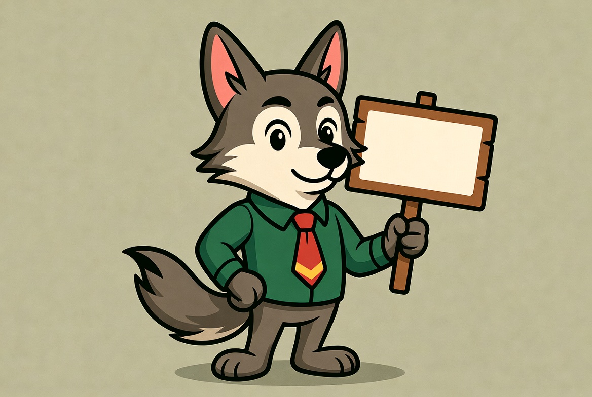 A cute cartoon wolf with gray fur, big eyes, and perky ears stands holding a blank wooden sign. He wears a green shirt and red tie, standing on a light beige background. His tail is fluffy and he smiles happily.