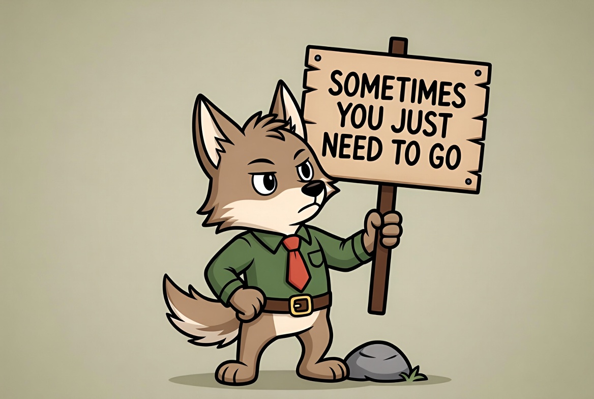 Cartoon wolf holding 'sometimes you just need to go' sign